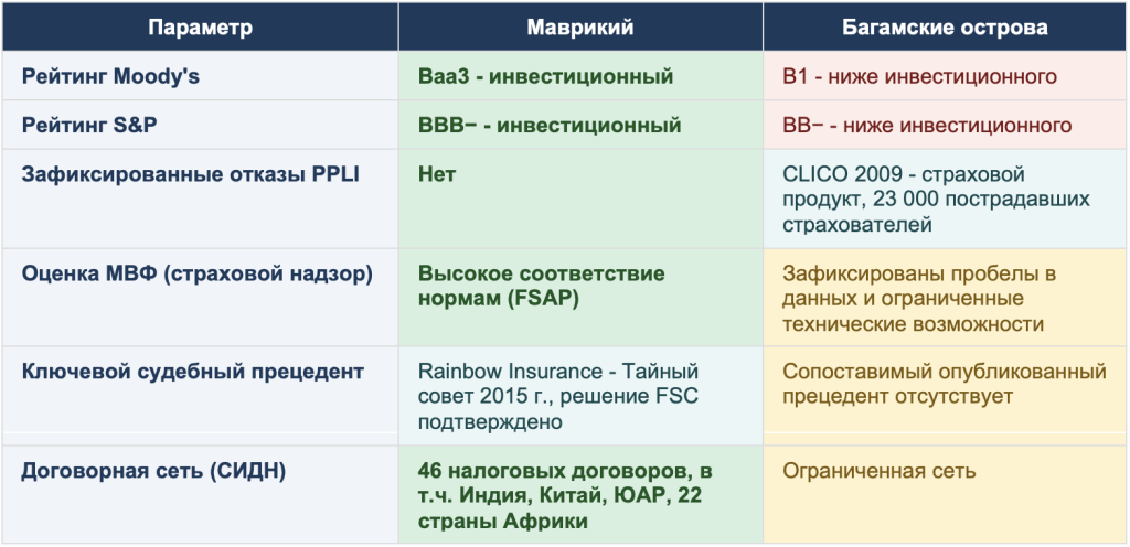 Багамские острова и Маврикий — обе юрисдикции активно используются для структурирования PPLI (частного страхования жизни с инвестиционной составляющей) для состоятельных международных клиентов. Обе работают в системе английского общего права, обе — члены ФАТФ и имеют независимые регуляторные органы. На первый взгляд — схожие варианты.