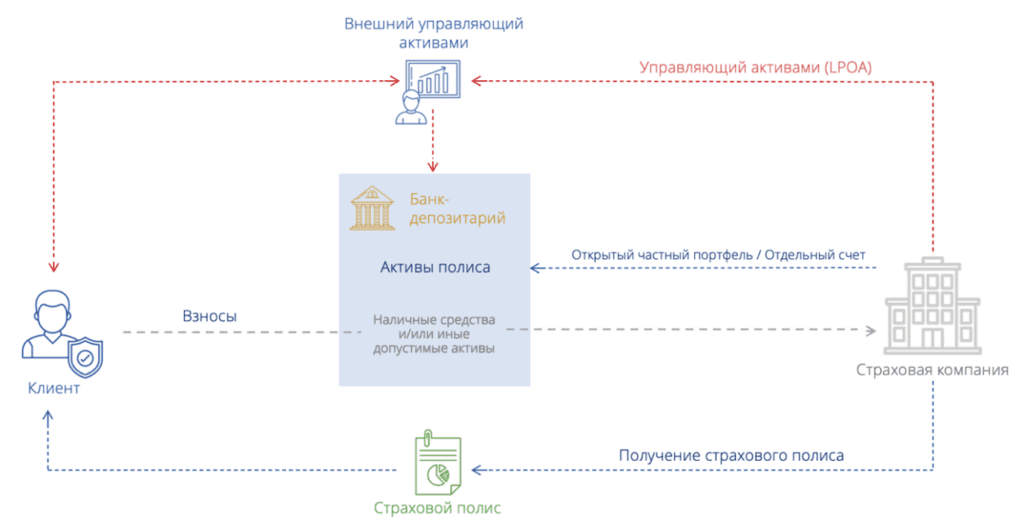Страховая компания открывает отдельный счет в депозитарии, куда переводятся ваши средства. Там формируется инвестиционный портфель. Управлять им можете вы сами или нанятый управляющий — как договоритесь.